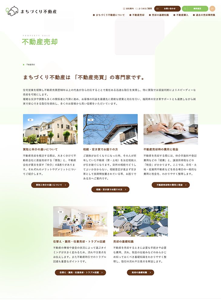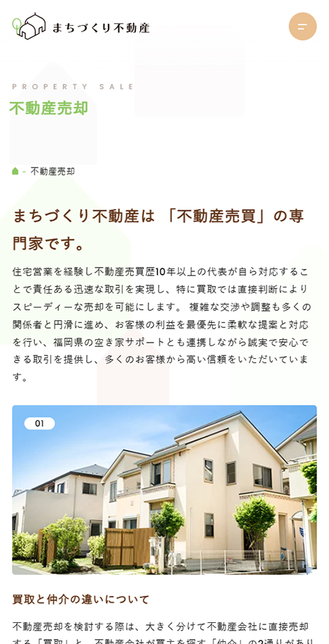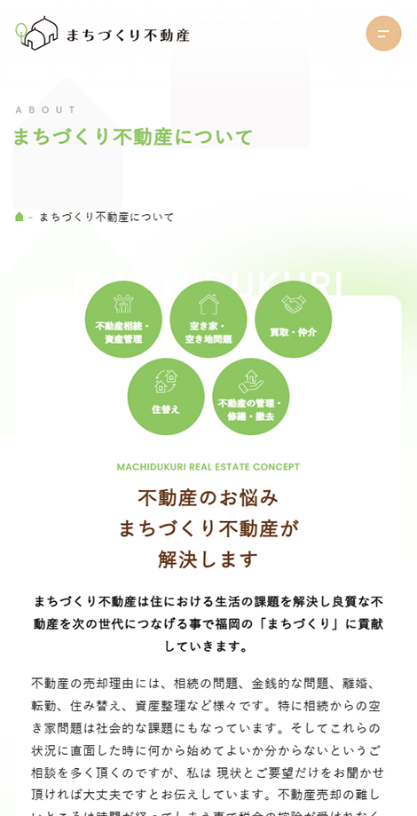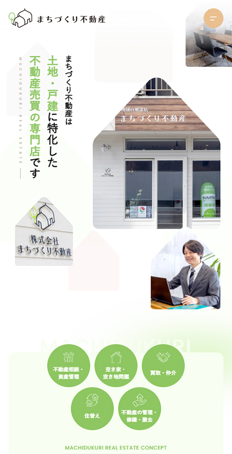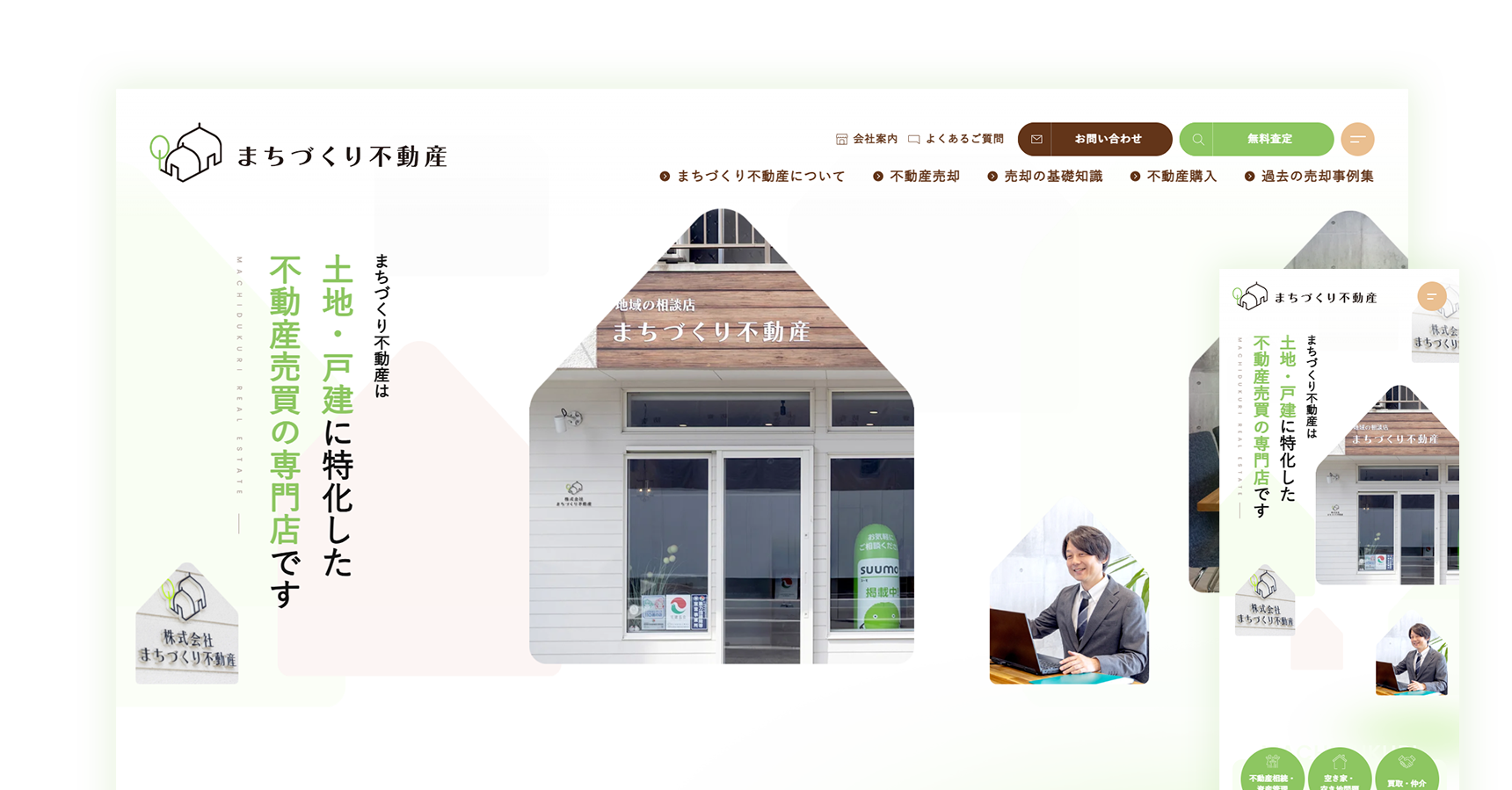 サイトデザインでは、まちづくり不動産様の親切で温かみのある対応や、やさしいお人柄が伝わるよう表現しました。