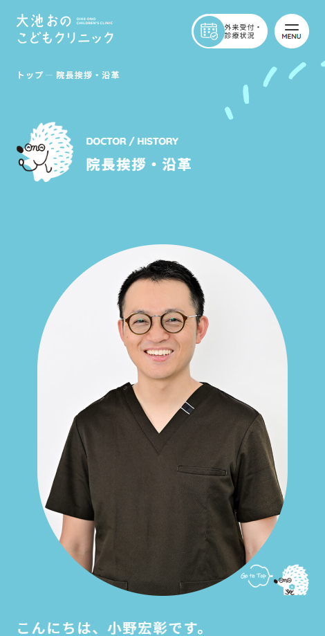 ハリネズミのキャラクターや、やさしい色使いを取り入れ、子どもと保護者が安心して訪れられる雰囲気を表現した小児科クリニックのサイトです。