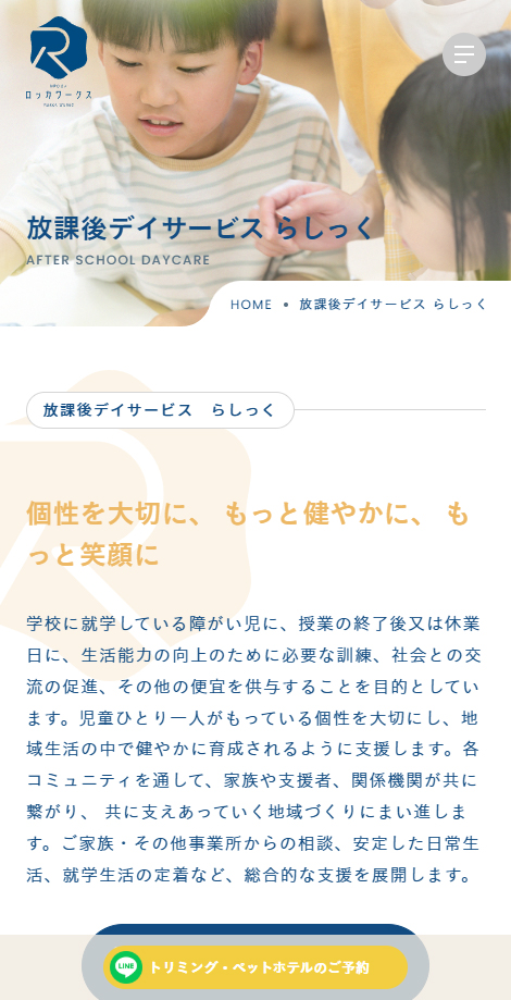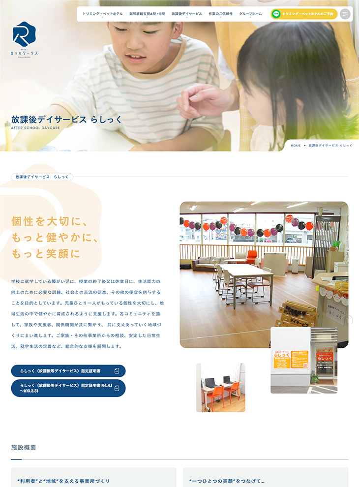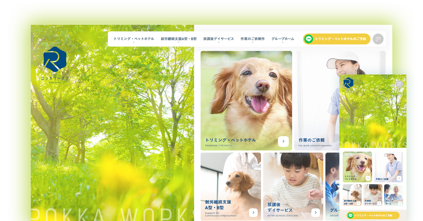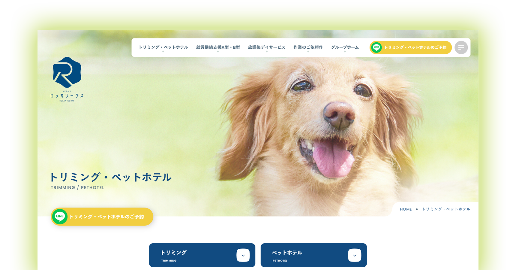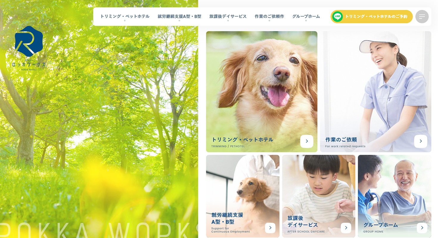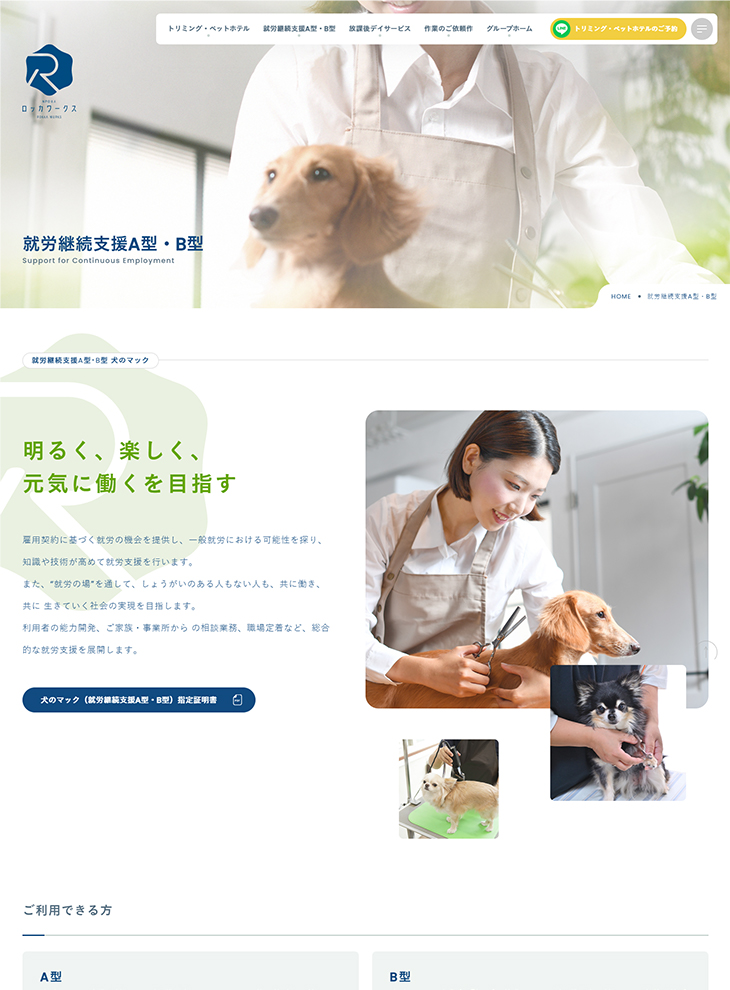 トリミング・ペットホテル、就労継続支援A型・B型、放課後等デイサービス、グループホームなど複数の事業の情報を整理して、わかりやすく使いやすいサイトを意識して制作いたしました。