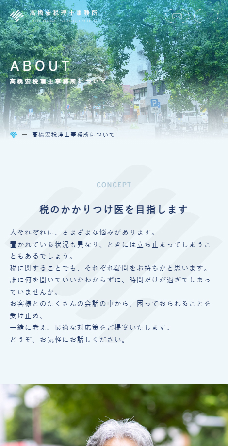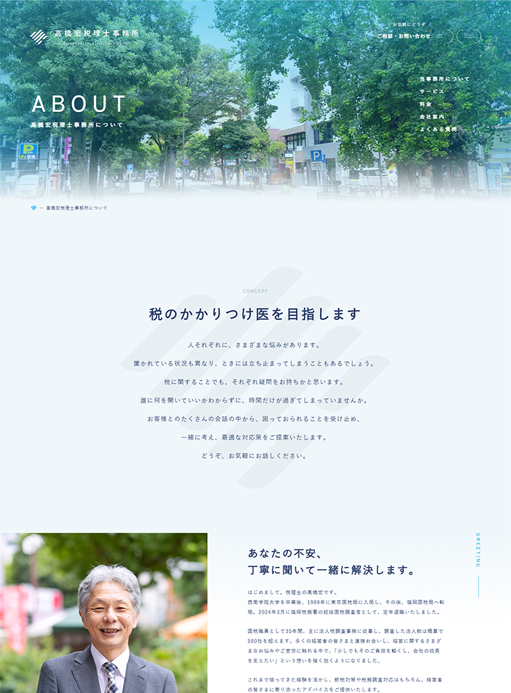 「何でも話せる税のかかりつけ医」をコンセプトに、初めての方でも安心して相談できる高橋様のお人柄や雰囲気を大切にしながら制作しました。